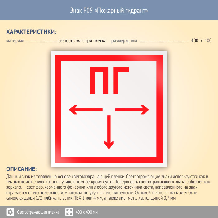 Знак F09 «Пожарный гидрант» (светоотражающая пленка, 400х400 мм) в Бердске купить
