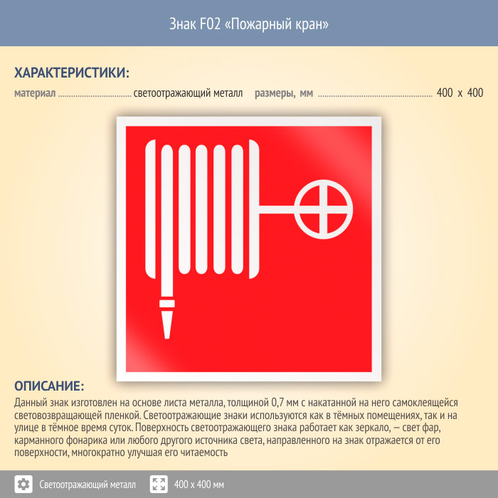Знак F02 «Пожарный кран» (светоотражающий металл, 400х400 мм) в Бердске купить