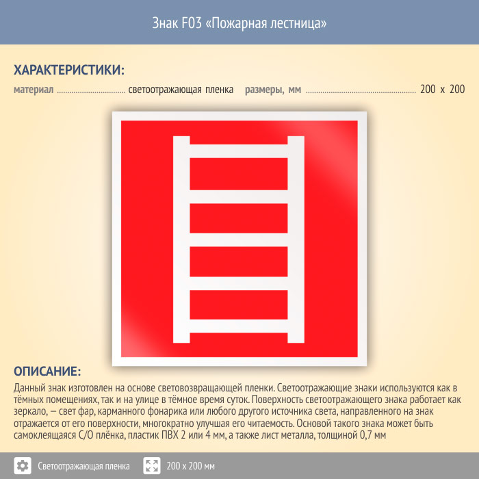 Знак F03 «Пожарная лестница» (светоотражающая пленка, 200х200 мм) в Бердске купить