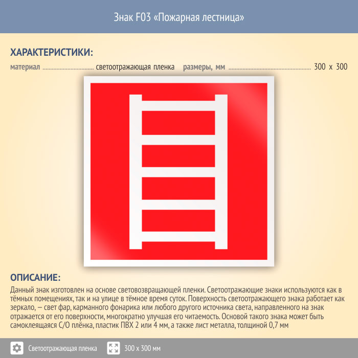 Знак F03 «Пожарная лестница» (светоотражающая пленка, 300х300 мм) в Бердске купить