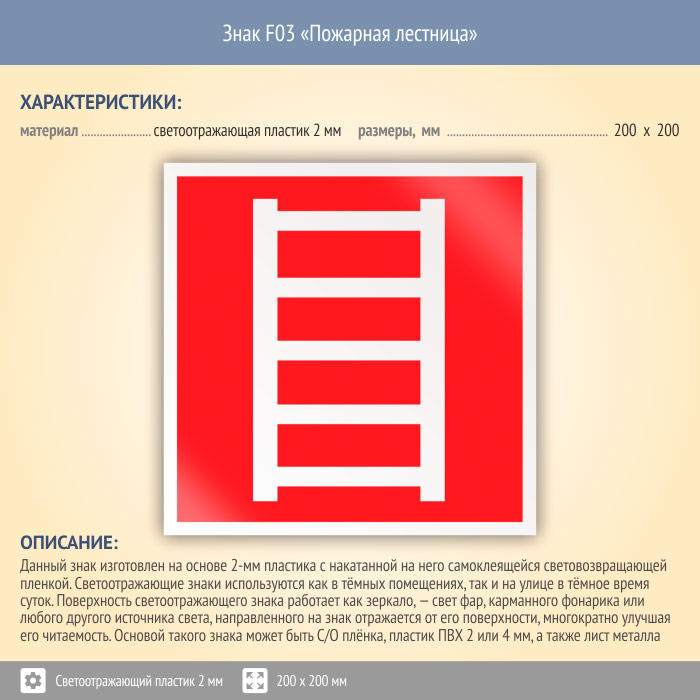 Знак F03 «Пожарная лестница» (светоотражающий пластик, 200х200 мм) в Бердске купить