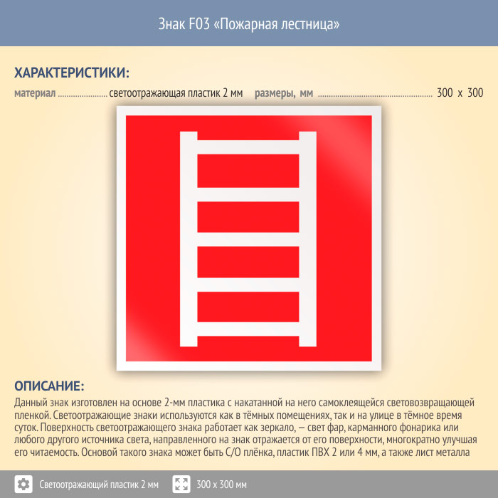 Знак F03 «Пожарная лестница» (светоотражающий пластик, 300х300 мм) в Бердске купить