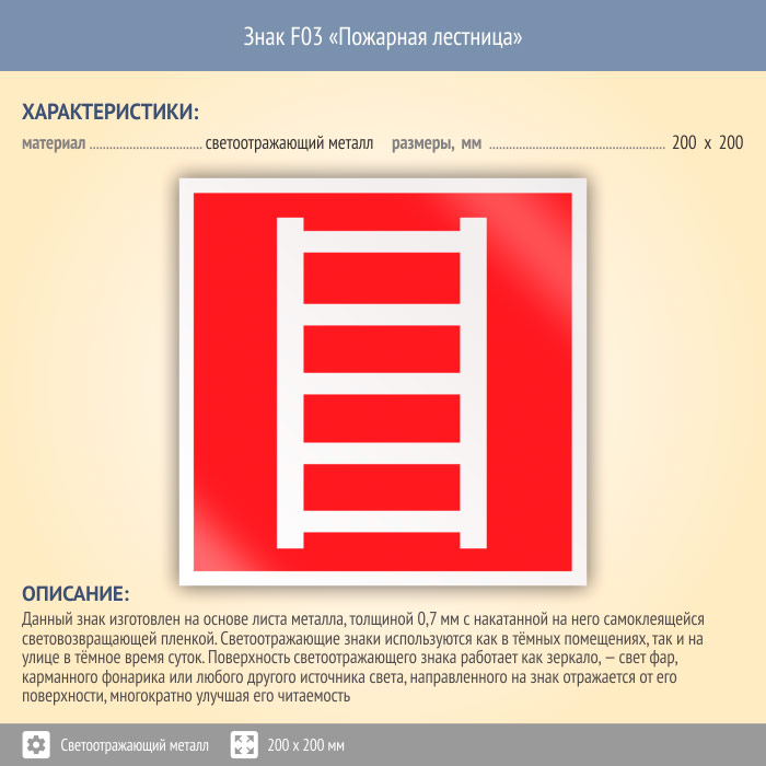 Знак F03 «Пожарная лестница» (светоотражающий металл, 200х200 мм) в Бердске купить