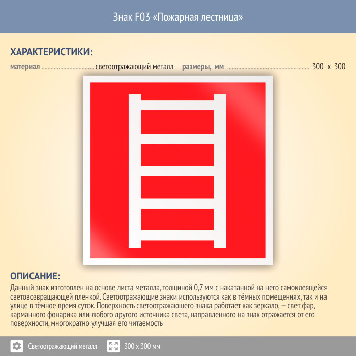 Знак F03 «Пожарная лестница» (светоотражающий металл, 300х300 мм) в Бердске купить