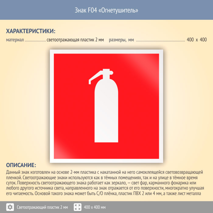 Знак F04 «Огнетушитель» (светоотражающий пластик, 400х400 мм) в Бердске купить