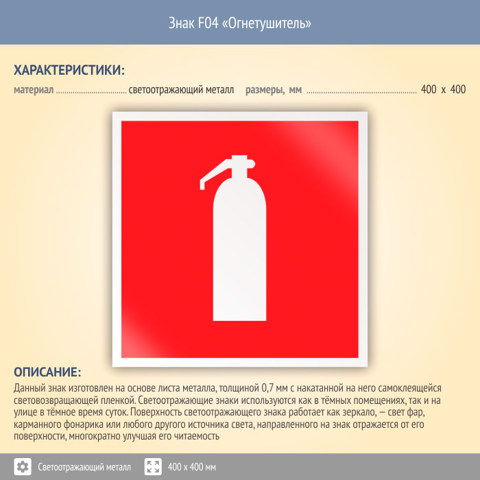 Знак F04 «Огнетушитель» (светоотражающий металл, 400х400 мм) в Бердске купить