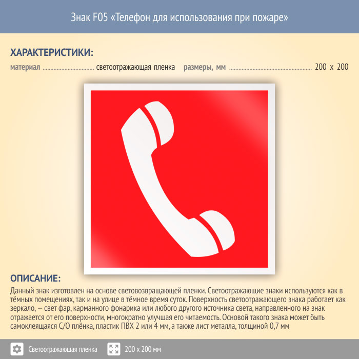Знак F05 «Телефон для использования при пожаре (в том числе телефон прямой связи с пожарной охраной)» (светоотражающая пленка, 200х200 мм) в Бердске купить