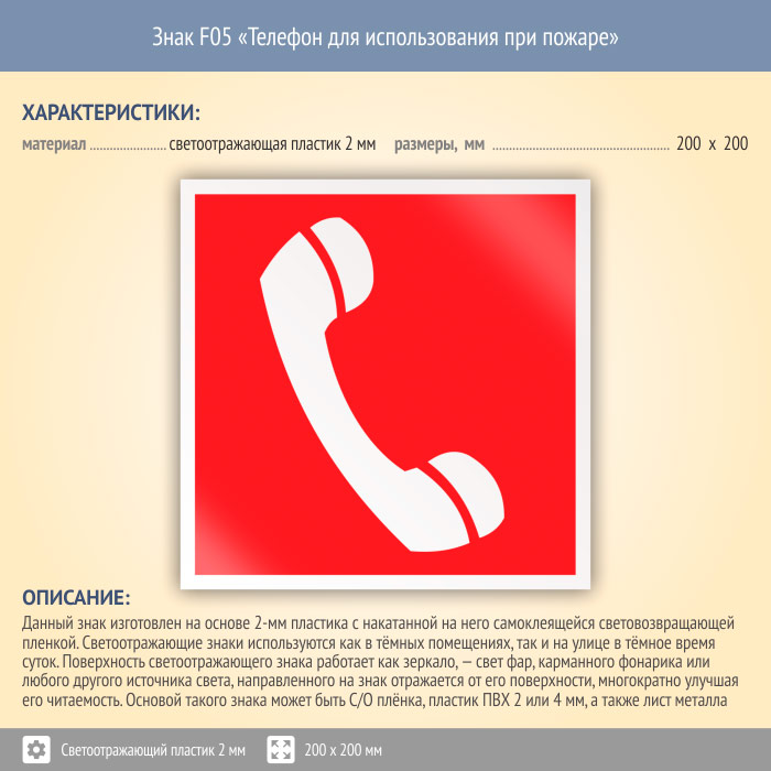 Знак F05 «Телефон для использования при пожаре (в том числе телефон прямой связи с пожарной охраной)» (светоотражающий пластик, 200х200 мм) в Бердске купить