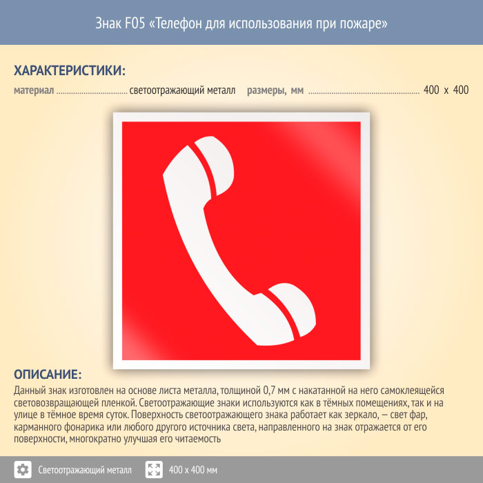 Знак F05 «Телефон для использования при пожаре (в том числе телефон прямой связи с пожарной охраной)» (светоотражающий металл, 400х400 мм) в Бердске купить