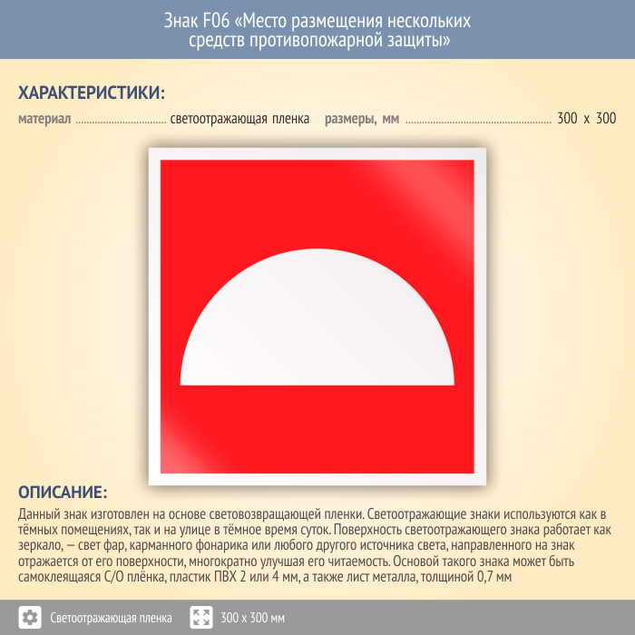 Знак F06 «Место размещения нескольких средств противопожарной защиты» (светоотражающая пленка, 300х300 мм) в Бердске купить