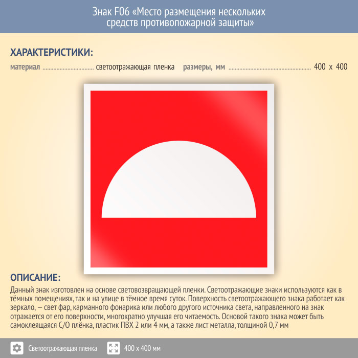 Знак F06 «Место размещения нескольких средств противопожарной защиты» (светоотражающая пленка, 400х400 мм) в Бердске купить
