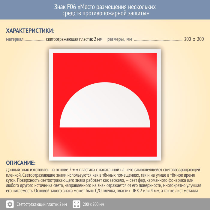 Знак F06 «Место размещения нескольких средств противопожарной защиты» (светоотражающий пластик, 200х200 мм) в Бердске купить