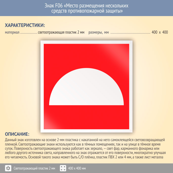 Знак F06 «Место размещения нескольких средств противопожарной защиты» (светоотражающий пластик, 400х400 мм) в Бердске купить