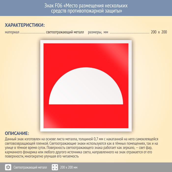 Знак F06 «Место размещения нескольких средств противопожарной защиты» (светоотражающий металл, 200х200 мм) в Бердске купить