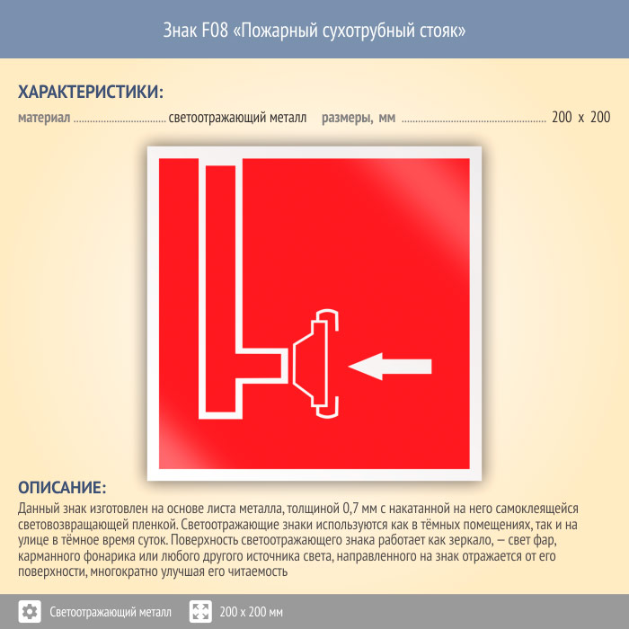 Знак F08 «Пожарный сухотрубный стояк» (светоотражающий металл, 200х200 мм) в Бердске купить