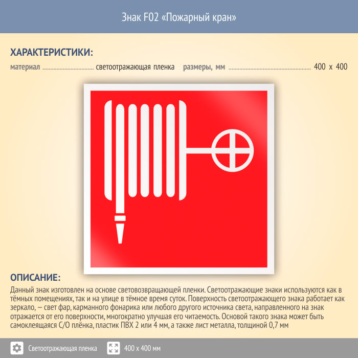 Знак F02 «Пожарный кран» (светоотражающая пленка, 400х400 мм) в Бердске купить