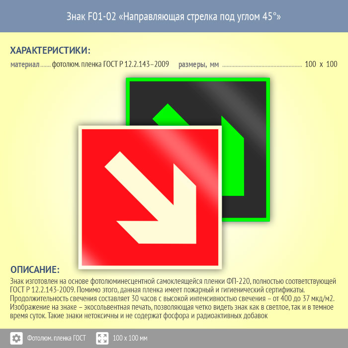 Знак F01-02 «Направляющая стрелка под углом 45°» (фотолюминесцентная пленка ГОСТ 34428-2018, 100х100 мм) в Бердске купить