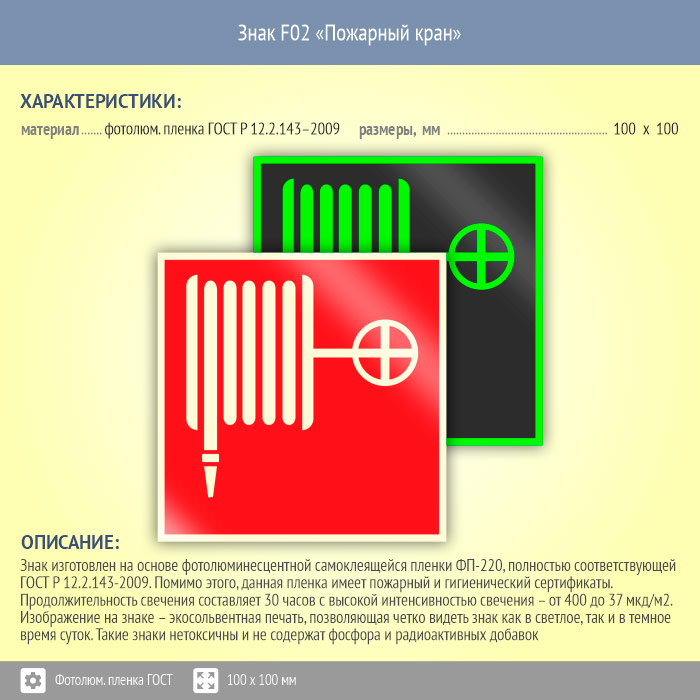 Знак F02 «Пожарный кран» (фотолюминесцентная пленка ГОСТ 34428-2018, 100х100 мм) в Бердске купить