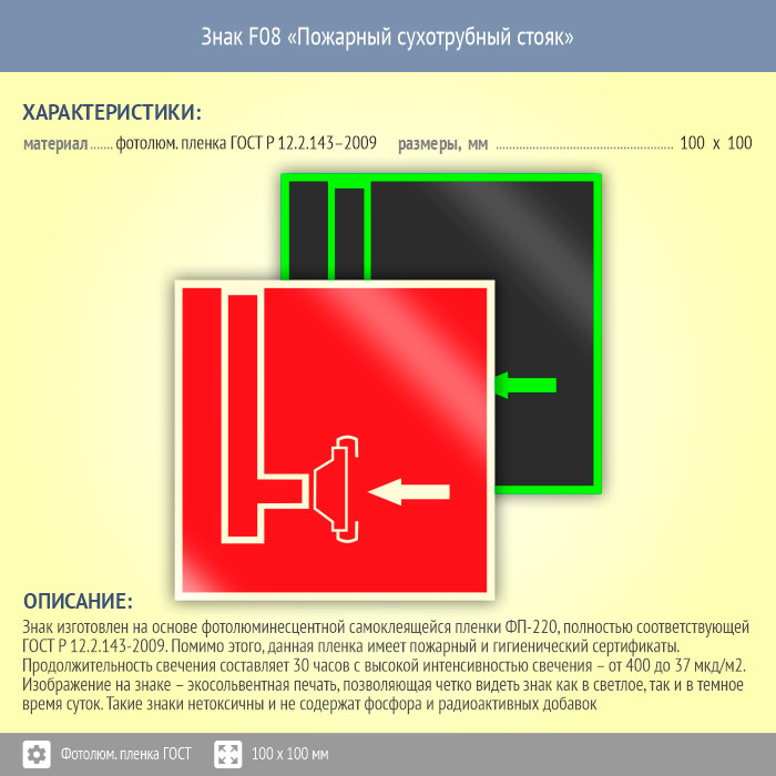 Знак F08 «Пожарный сухотрубный стояк» (фотолюминесцентная пленка ГОСТ 34428-2018, 100х100 мм) в Бердске купить