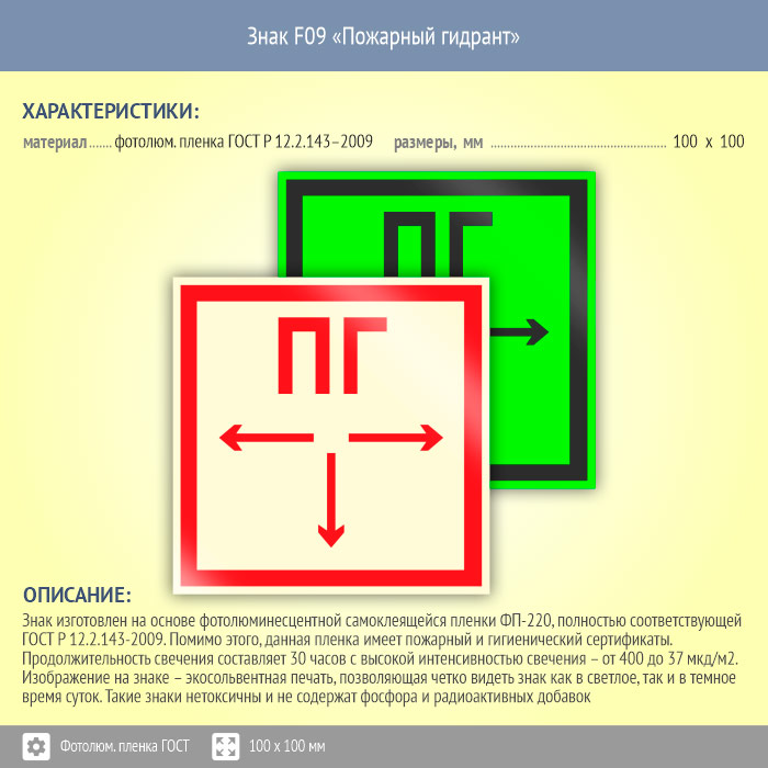 Знак F09 «Пожарный гидрант» (фотолюминесцентная пленка ГОСТ 34428-2018, 100х100 мм) в Бердске купить