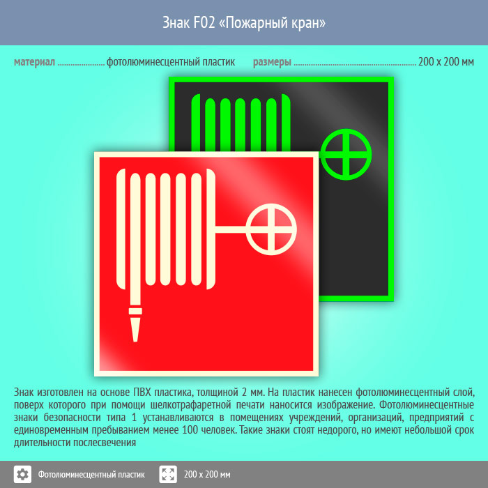Знак F02 «Пожарный кран» (фотолюминесцентный пластик, 200х200 мм) в Бердске купить