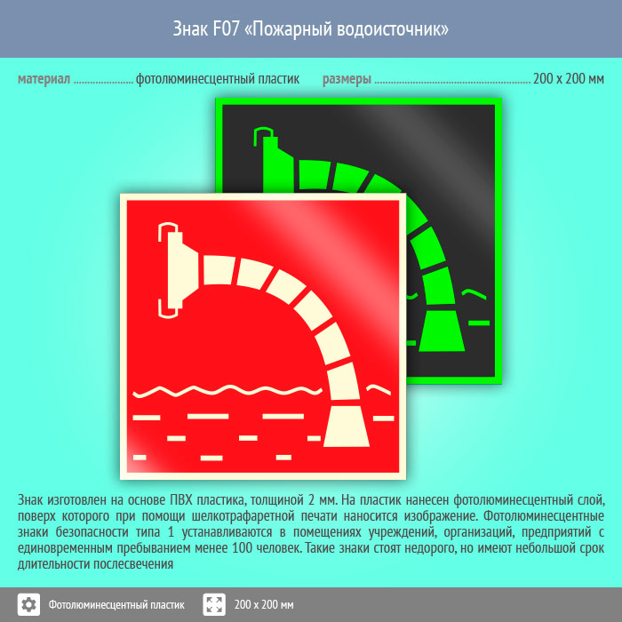 Знак F07 «Пожарный водоисточник» (фотолюминесцентный пластик, 200х200 мм) в Бердске купить