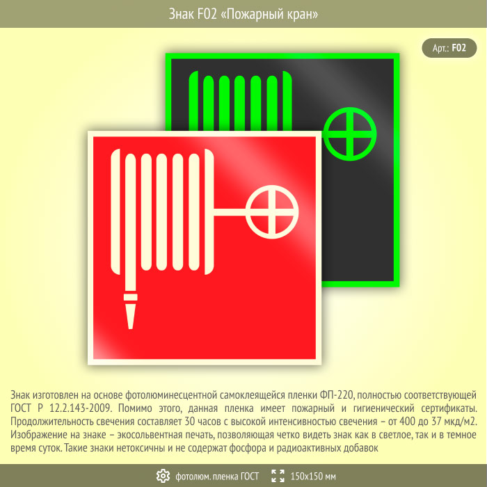 Знак F02 «Пожарный кран» (фотолюминесцентная пленка ГОСТ 34428-2018, 150х150 мм) в Бердске купить
