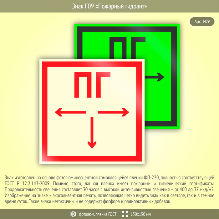 Знак F09 «Пожарный гидрант» (фотолюминесцентная пленка ГОСТ 34428-2018, 150х150 мм) в Бердске купить