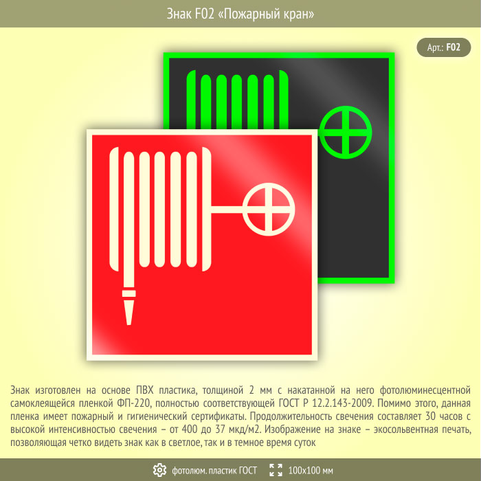 Знак F02 «Пожарный кран» (фотолюминесцентный пластик ГОСТ 34428-2018, 100х100 мм) в Бердске купить
