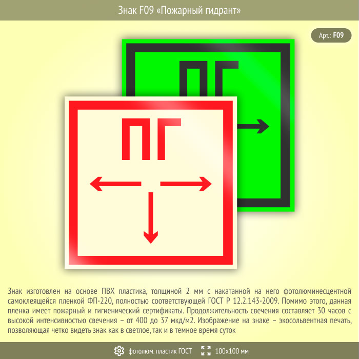 Знак F09 «Пожарный гидрант» (фотолюминесцентный пластик ГОСТ 34428-2018, 100х100 мм) в Бердске купить