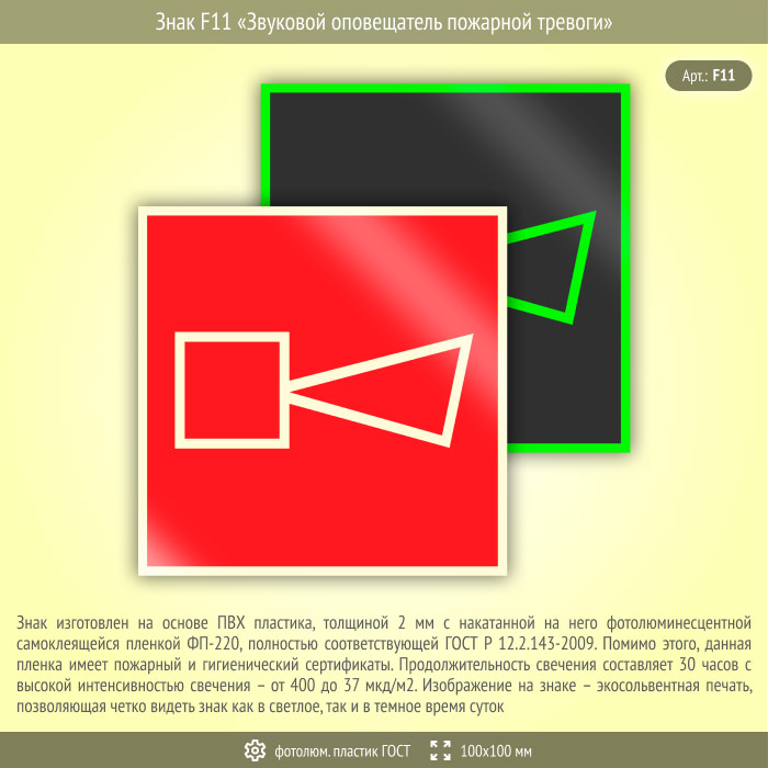Знак F11 «Звуковой оповещатель пожарной тревоги» (фотолюминесцентный пластик ГОСТ 34428-2018, 100х100 мм) в Бердске купить