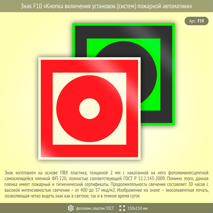 Знак F10 «Кнопка включения установок (систем) пожарной автоматики» (фотолюминесцентный пластик ГОСТ 34428-2018, 150х150 мм) в Бердске купить