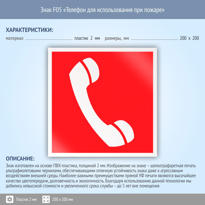 Знак F05 «Телефон для использования при пожаре (в том числе телефон прямой связи с пожарной охраной)» (пластик, 200х200 мм) в Бердске купить