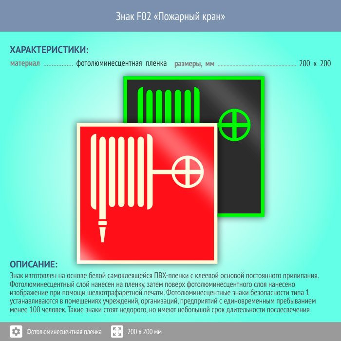 Знак F02 «Пожарный кран» (фотолюминесцентная пленка, 200х200 мм) в Бердске купить