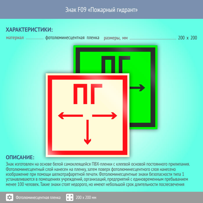 Знак F09 «Пожарный гидрант» (фотолюминесцентная пленка, 200х200 мм) в Бердске купить