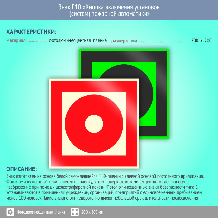 Знак F10 «Кнопка включения установок (систем) пожарной автоматики» (фотолюминесцентная пленка, 200х200 мм) в Бердске купить
