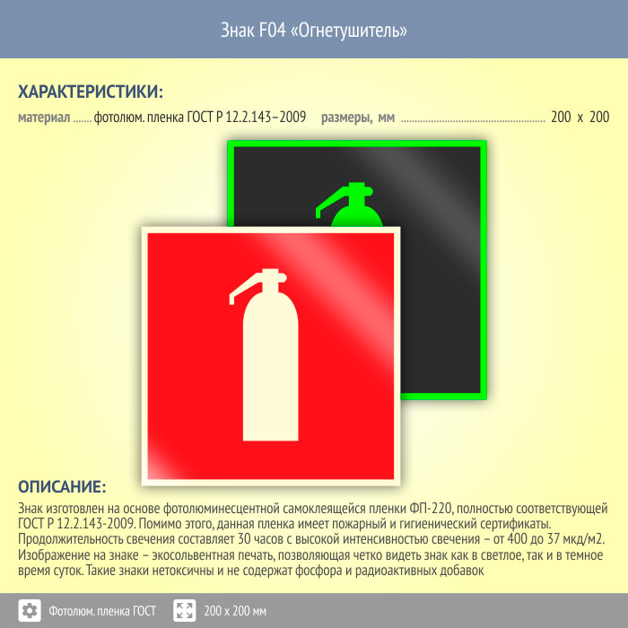 Знак F04 «Огнетушитель» (фотолюминесцентная пленка ГОСТ 34428-2018, 200х200 мм) в Бердске купить