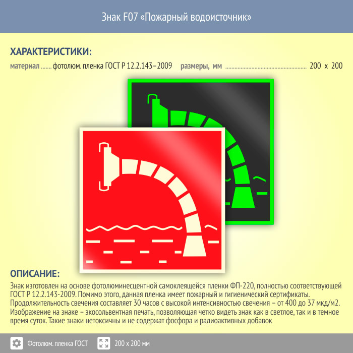 Знак F07 «Пожарный водоисточник» (фотолюминесцентная пленка ГОСТ 34428-2018, 200х200 мм) в Бердске купить