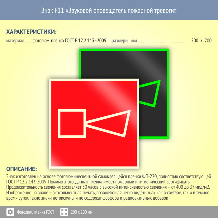 Знак F11 «Звуковой оповещатель пожарной тревоги» (фотолюминесцентная пленка ГОСТ 34428-2018, 200х200 мм) в Бердске купить