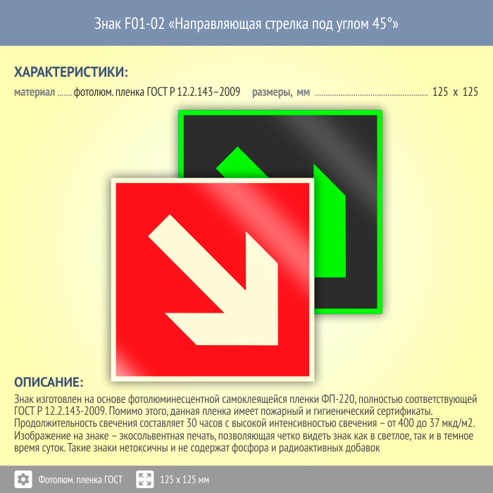 Знак F01-02 «Направляющая стрелка под углом 45°» (фотолюминесцентная пленка ГОСТ 34428-2018, 125х125 мм) в Бердске купить