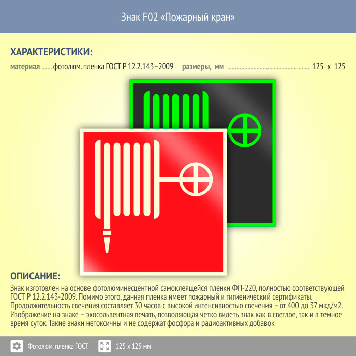 Знак F02 «Пожарный кран» (фотолюминесцентная пленка ГОСТ 34428-2018, 125х125 мм) в Бердске купить