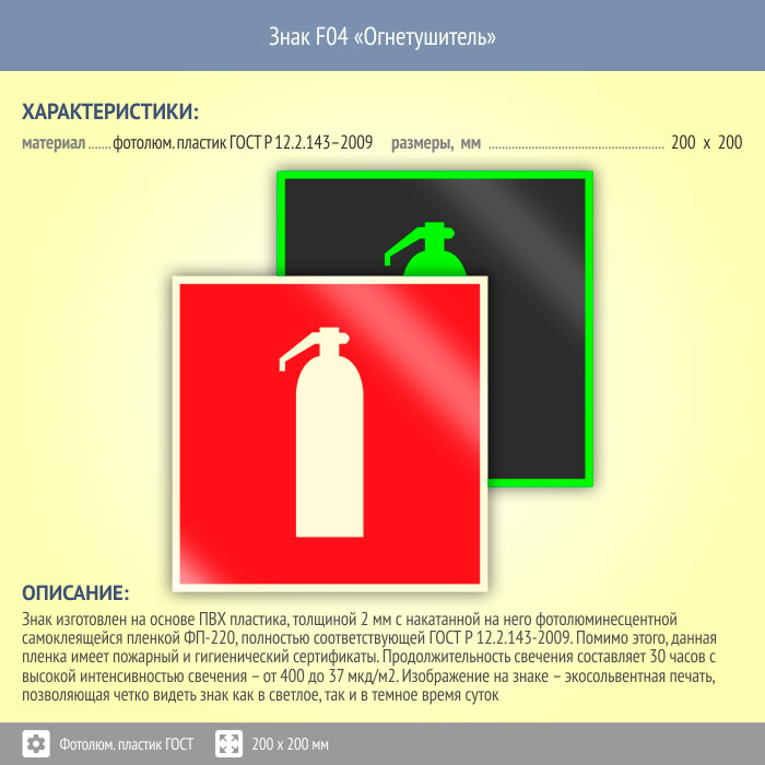 Знак F04 «Огнетушитель» (фотолюминесцентный пластик ГОСТ 34428-2018, 200х200 мм) в Бердске купить