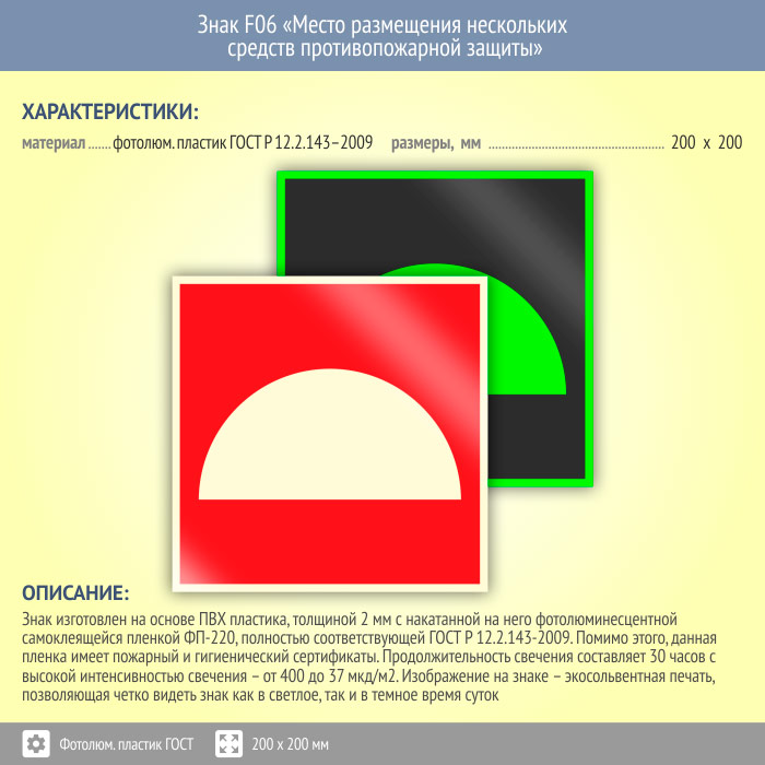 Знак F06 «Место размещения нескольких средств противопожарной защиты» (фотолюминесцентный пластик ГОСТ 34428-2018, 200х200 мм) в Бердске купить