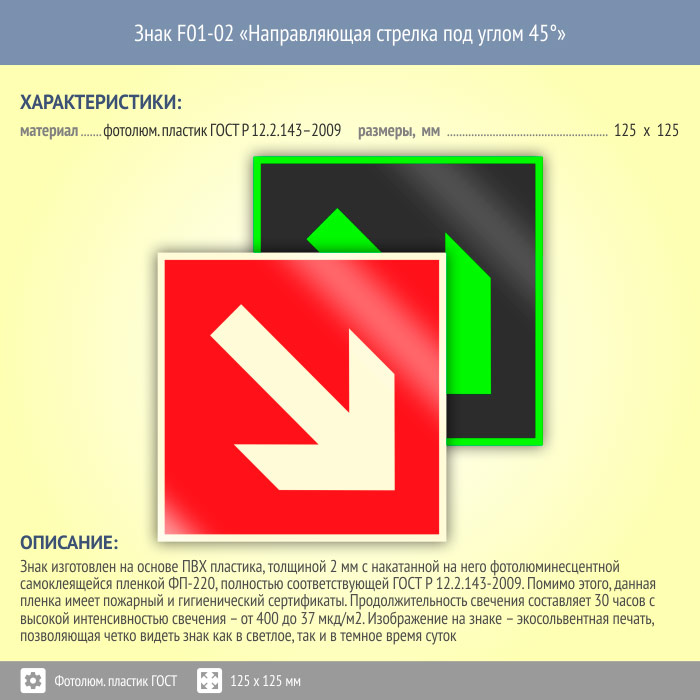 Знак F01-02 «Направляющая стрелка под углом 45°» (фотолюминесцентный пластик ГОСТ 34428-2018, 125х125 мм) в Бердске купить