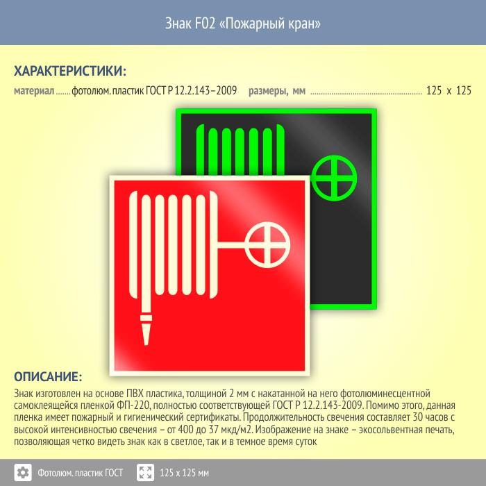 Знак F02 «Пожарный кран» (фотолюминесцентный пластик ГОСТ 34428-2018, 125х125 мм) в Бердске купить