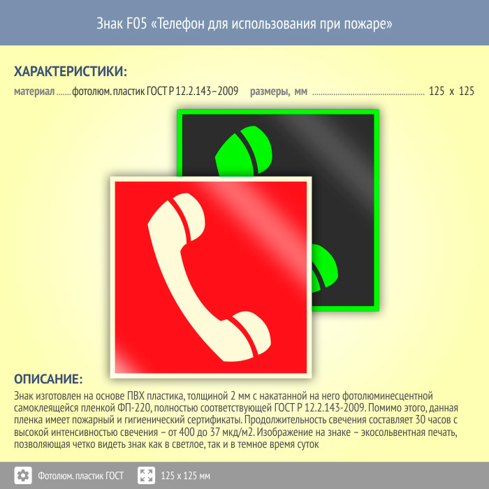 Знак F05 «Телефон для использования при пожаре (в том числе телефон прямой связи с пожарной охраной)» (фотолюминесцентный пластик ГОСТ 34428-2018, 125х125 мм) в Бердске купить