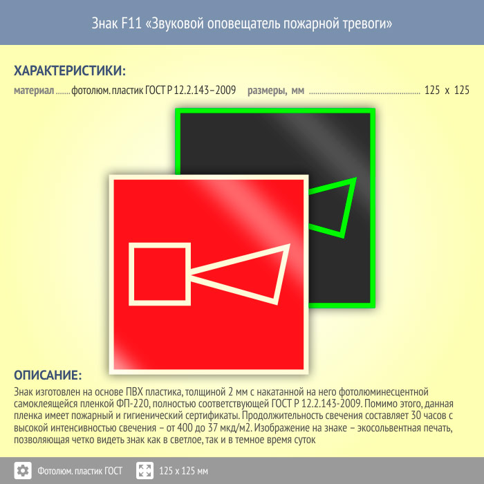 Знак F11 «Звуковой оповещатель пожарной тревоги» (фотолюминесцентный пластик ГОСТ 34428-2018, 125х125 мм) в Бердске купить