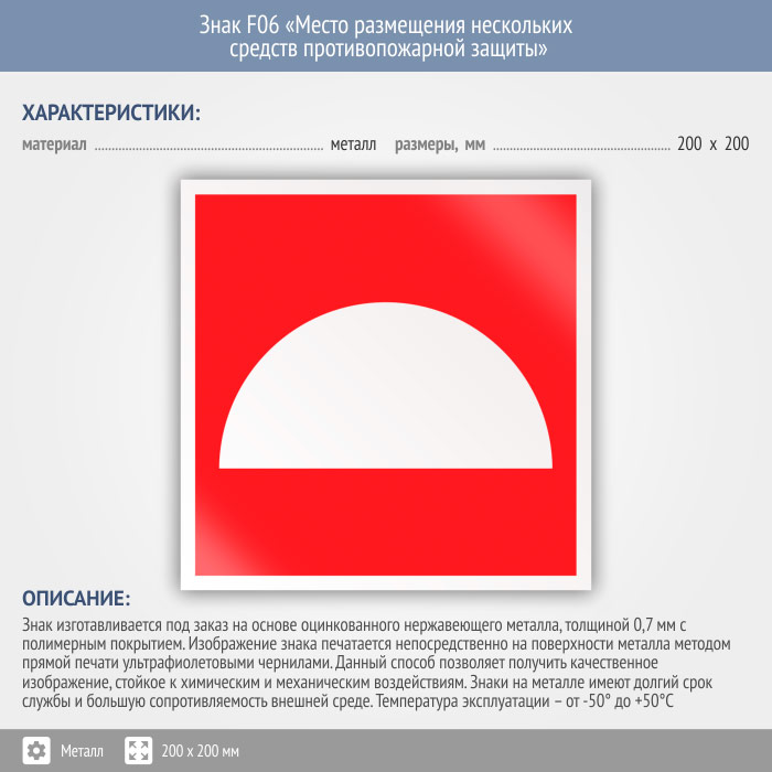 Знак F06 «Место размещения нескольких средств противопожарной защиты» (металл, 200х200 мм) в Бердске купить