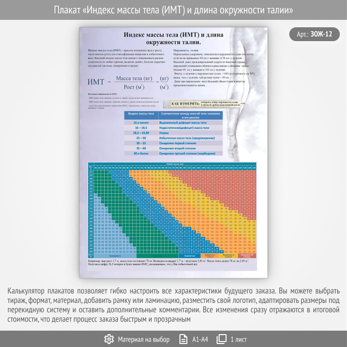 Плакат «Индекс массы тела (ИМТ) и длина окружности талии» (ЗОЖ-12, 1 лист) в Бердске купить